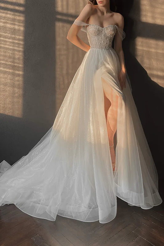A Line Sweetheart Pearl sheer Bohemian wedding dress