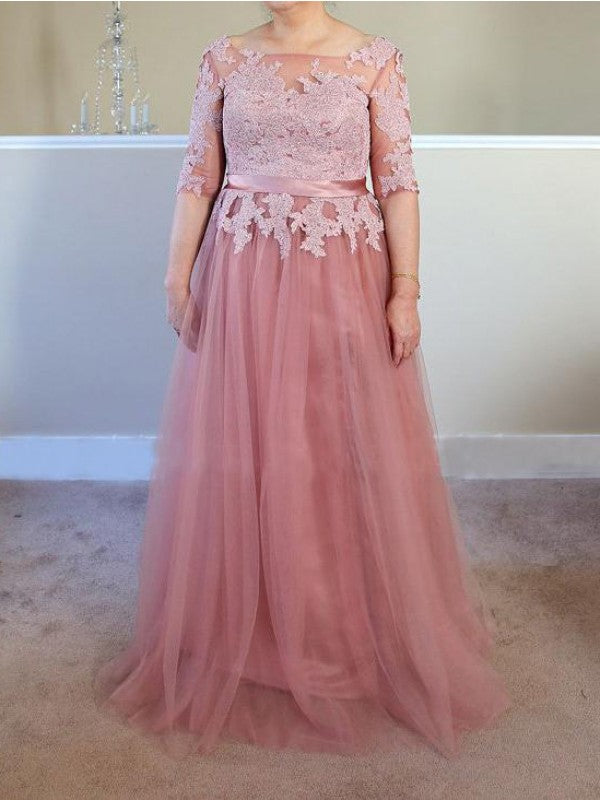 A-line boat 1/2 sleeve decal and ground length chiffon mother of the bride dress