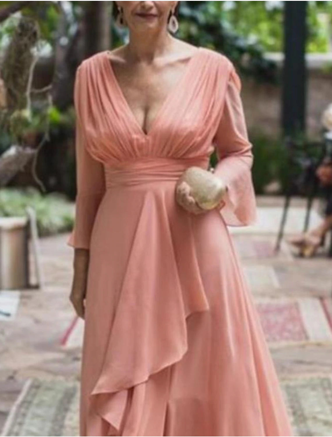 A-Line Mother of the Bride Dress Formal Wedding Guest Elegant V Neck Floor Length Chiffon 3/4 Length Sleeve with Pleats Ruffles
