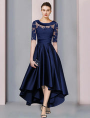 A-Line Mother of the Bride Dress Wedding Guest Elegant High Low Scoop Neck Asymmetrical Tea Length Satin Lace Half Sleeve with Appliques - Navy Blue / US 2 / UK 6 / EU 32