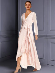 A-Line Mother of the Bride Dress Wedding Guest Elegant High Low V Neck Asymmetrical Tea Length Chiffon Long Sleeve with Ruched Split Front - US 2 / UK 6 / EU 32