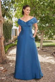 A-line off shoulder collar, high waisted belt, and floor length mother of bride dress - US 2 / UK 6 / EU 32