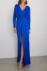 Simple V-neck long sleeved pleated slit for mother of the bride dress - Blue / US 2 / UK 6 / EU 32