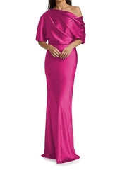 Tight fit/columnar woven satin pleats on one shoulder 1/2 sleeves and floor length Mother of the bride dress - Fuchsia