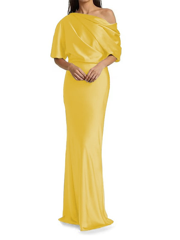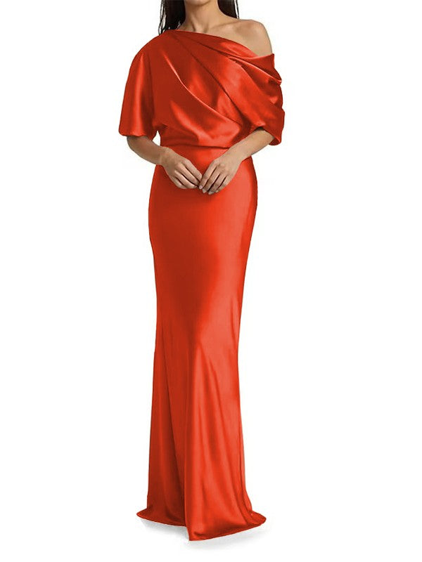 Tight fit/columnar woven satin pleats on one shoulder 1/2 sleeves and floor length Mother of the bride dress