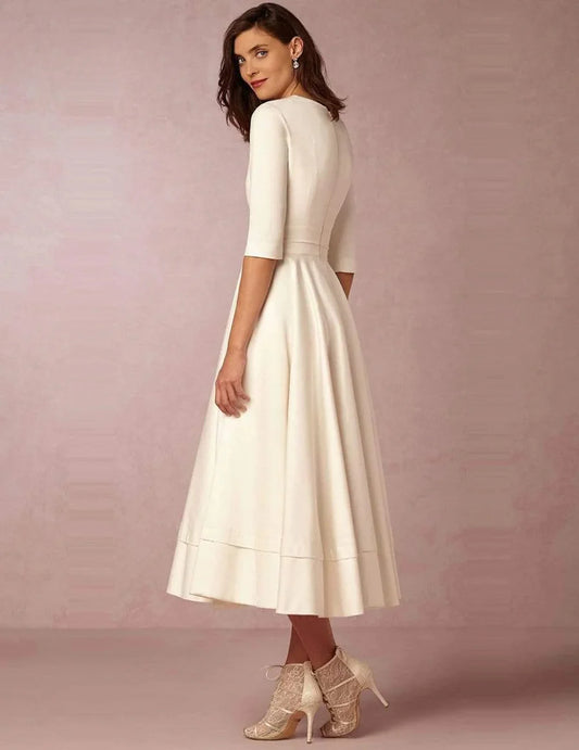 Elegant Fit-and-Flare V-Neck Three-Quarter-Sleeve Round-Back Midi Wedding Dress