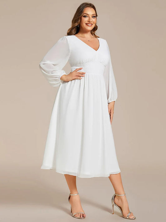 Plus Size Flowy Long Sleeves V-Neck Midi Chiffon Wedding Guest Dress