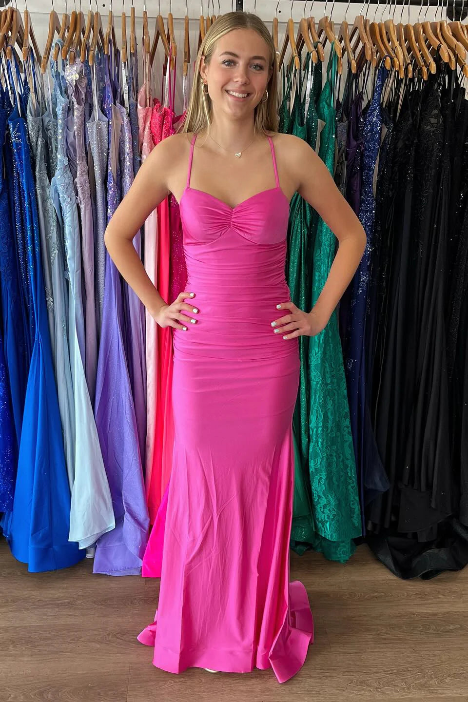 Bold Sweetheart Neck Spaghetti Strap Ruched Mermaid Evening Dress with Crisscross Lace-Up Back & Train in Hot Pink