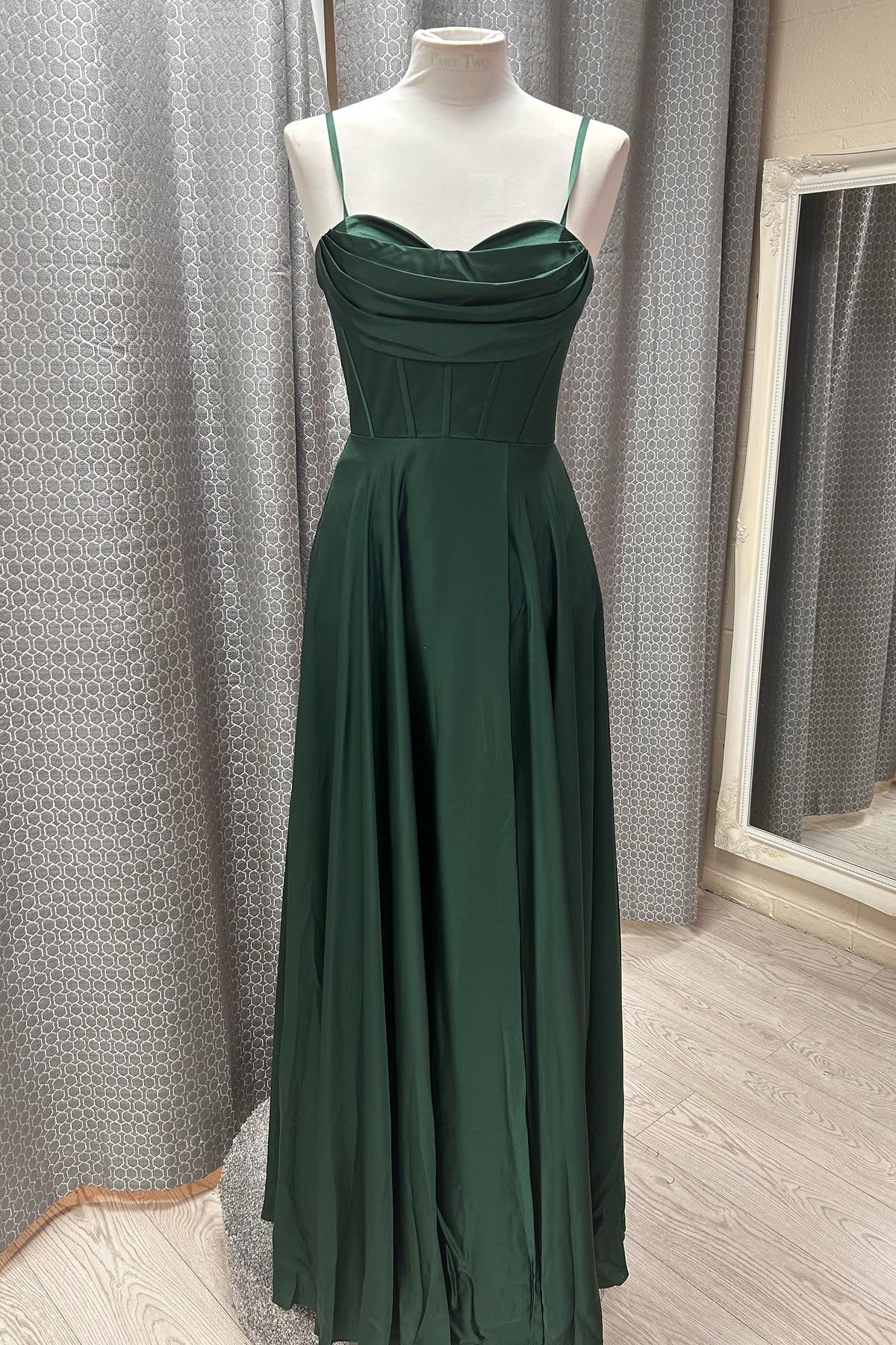 Elegant Cowl Neck Spaghetti Strap Satin A-Line Evening Dress with Corset Bodice in Emerald Green