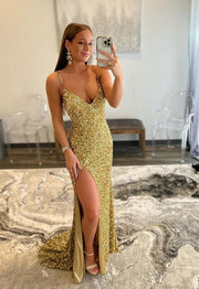 Glamorous Plunging V-Neck Gold Sequin Evening Dress with Crisscross Lace-Up Open Back, High Thigh Slit & Body-Skimming Floor-Length Train