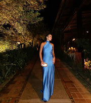Halter Neck Satin Backless Maxi Dress Sleeveless Open Back Formal Evening Prom Wedding Guest Party Gown - Blue / US 2 / UK 6 / EU 32