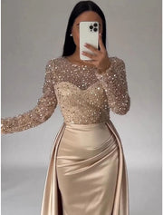 Meerjungfrau Pailletten Abendkleid Gerafftes Satinkleid Lange Ärmel Bodenlang Funkelnder Illusionsausschnitt Herbst Hochzeitsgästekleid mit Perlen Überrock - Sekt / US 2 / UK 6 / EU 32