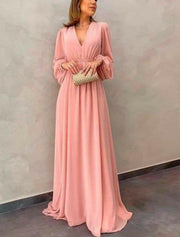 A-Linie Kleid für die Mutter der Braut, formeller Hochzeitsgast, elegant, V-Ausschnitt, Schleppe/Pinselzug, Chiffon, lange Ärmel mit Falten