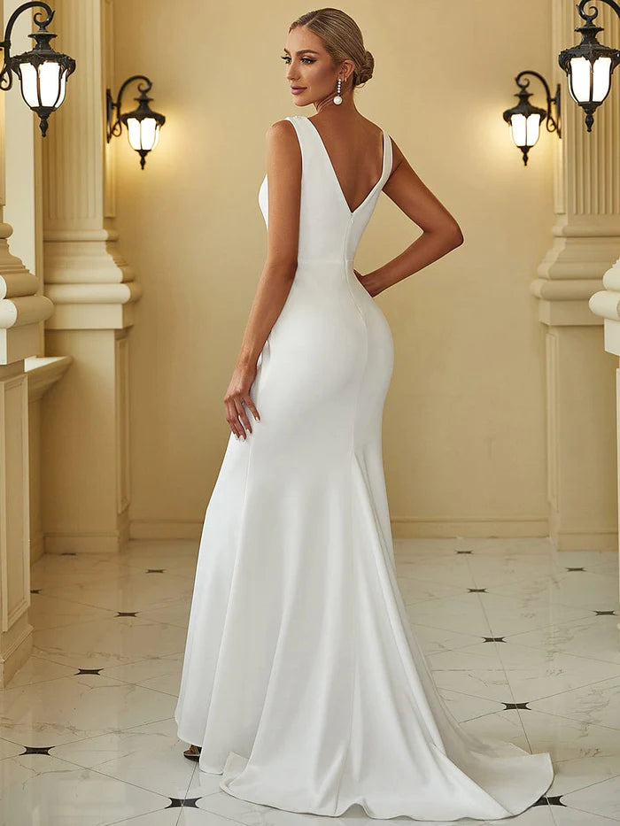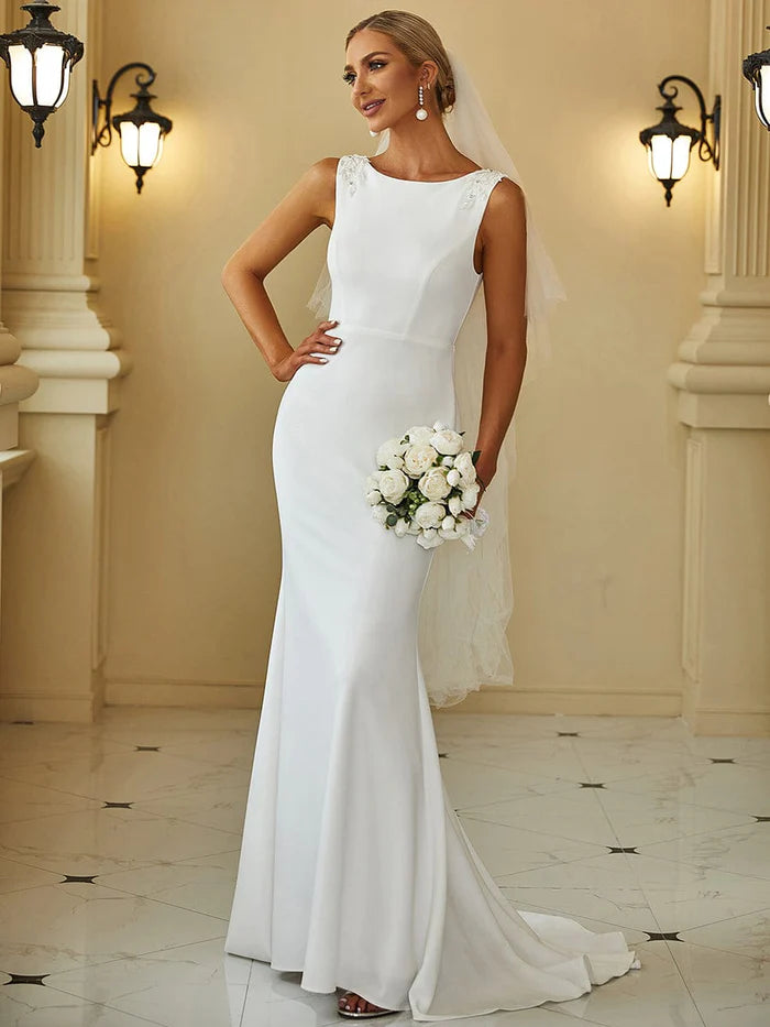 Figurbetontes, ärmelloses Brautkleid mit hohem Ausschnitt und tiefem Rückenausschnitt und Fischschwanz - Weiß