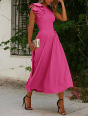 A-Linien-Kleid für Hochzeitsgäste, rückenfreies Kleid, Sommer, halbformell, teelang, ärmellos, Rundhalsausschnitt, Stretchstoff mit Rüschen - Knalliges Pink / US 2 / UK 6 / EU 32