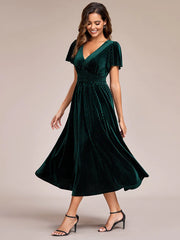 Anmutiges V-Ausschnitt-Taillendesign Kurze Ärmel Herbst-Midikleid aus Samt für Hochzeitsgäste
