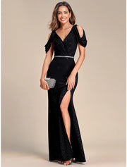 Meerjungfrau/Trompete Hochzeitsgastkleider Sparkle & Shine Kleid Formelle Hochzeit Bodenlang Kurzarm V-Ausschnitt Spitze mit Pailletten Schlitz - Schwarz / US 2 / UK 6 / EU 32