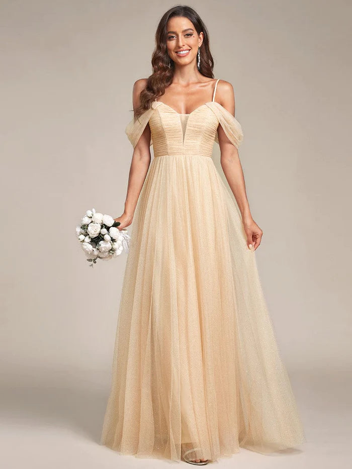 Schulterfreies Brautjungfernkleid aus Tüll mit Spaghettiträgern und plissierten Pailletten