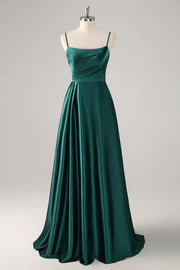 Robe de demoiselle d'honneur en satin plissé à fines bretelles vert foncé, coupe trapèze