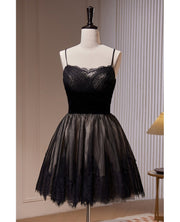 Robe de soirée courte sans manches noire élégante et sexy associée à des bretelles en dentelle, robe de cocktail courte noire dos nu à col suspendu