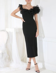 Robe de cocktail fourreau/colonne élégante, robe formelle pour invité de mariage, longueur thé, sans manches, col carré, tulle avec fente sur l'épaule et fleur