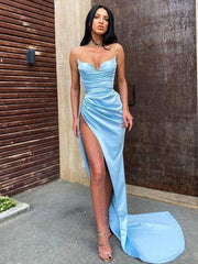 Robe fourreau/colonne en satin à bretelles spaghetti sans manches, froncée, traîne courte/pinceau - Bleu / US 2 / UK 6 / UE 32