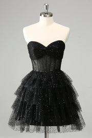Jolie robe de rentrée noire brillante à volants et à sequins, style corset plissé moulant