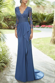 Robe de mère de la mariée empire à col en V et manches 3/4 avec appliques en dentelle