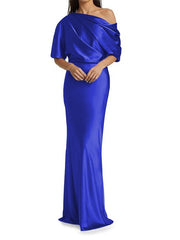 Robe de mère de la mariée en satin tissé, coupe ajustée/colonne, plis sur une épaule, manches 1/2 et longueur au sol - Bleu royal