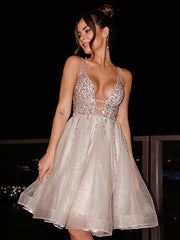 Robe de soirée courte/mini, coupe trapèze/princesse, sans manches, col en V, tulle et perles