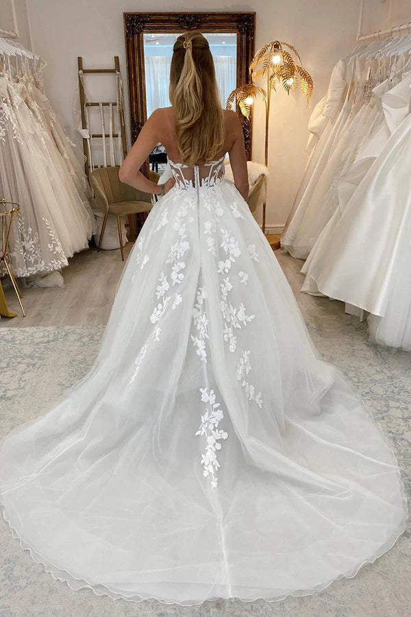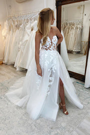 Robe de mariée fendue style rural en dentelle avec décolleté en V et illusion trapèze - Blanc