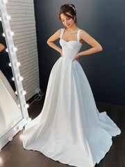 Robe de mariée trapèze/princesse en satin à volants et bretelles, sans manches, traîne courte