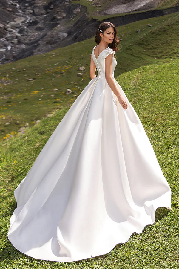 Robe de mariée simple en satin perlé avec manches en forme de cuillère et traîne palais
