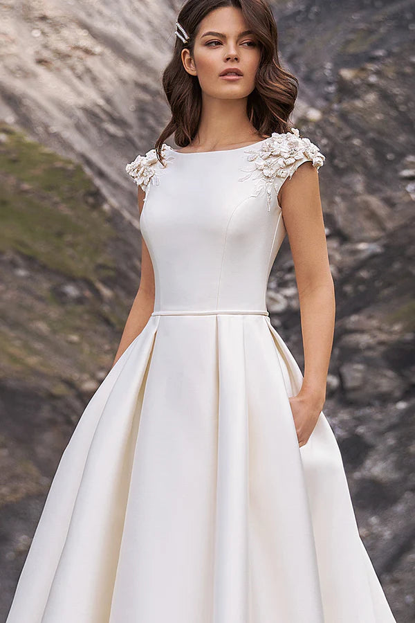 Robe de mariée simple en satin perlé avec manches en forme de cuillère et traîne palais - Ivoire