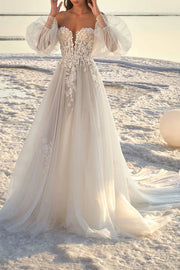 Robe de mariée de plage formelle, jupe trapèze en dentelle, robe de mariée d'été à manches longues