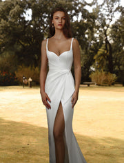 Robes de mariée décontractées à col en V, coupe trapèze, bretelles spaghetti, traîne courte, en satin, fendues sur le devant, drapées sur le côté, pour soirée de mariage d'été et d'automne - Ivoire