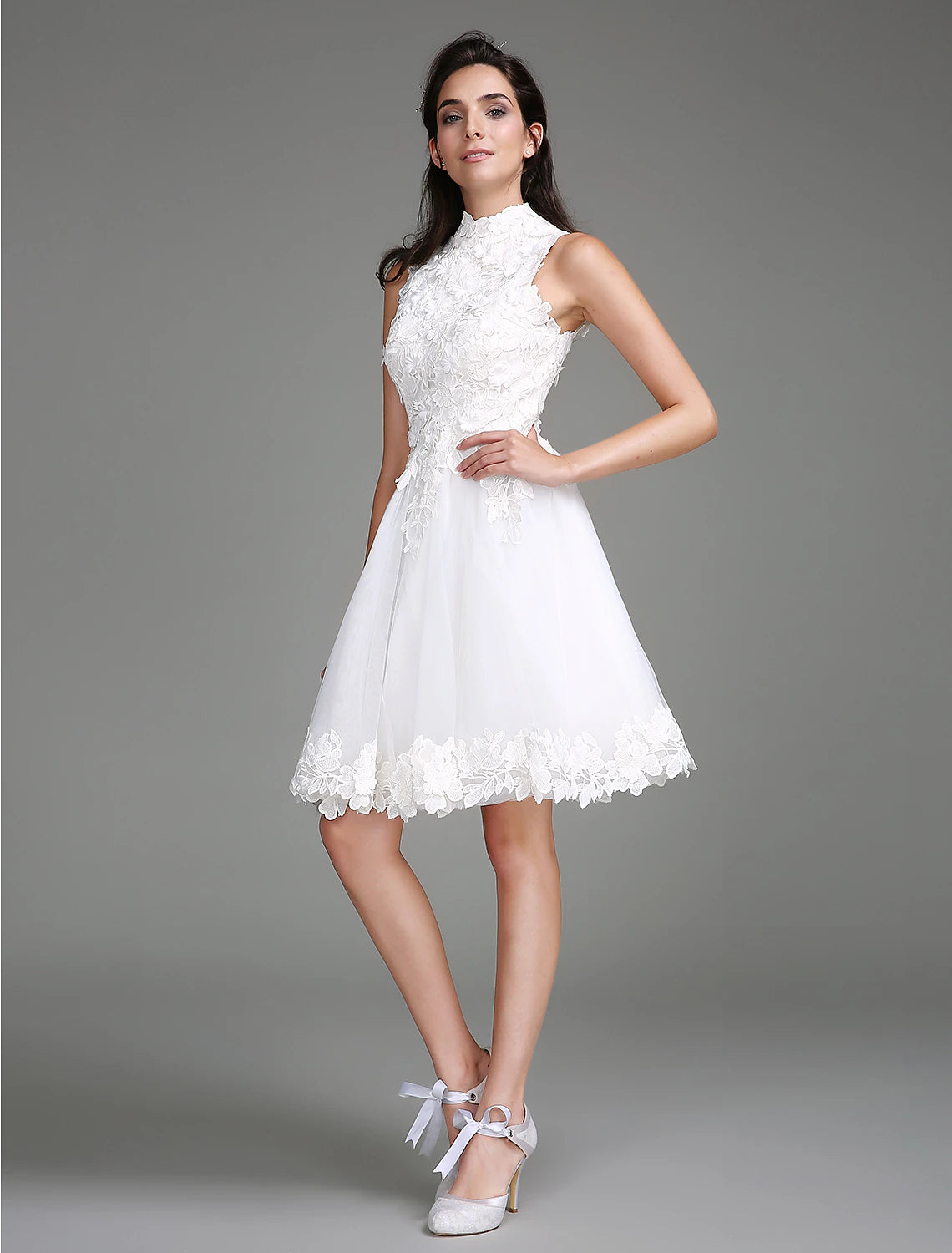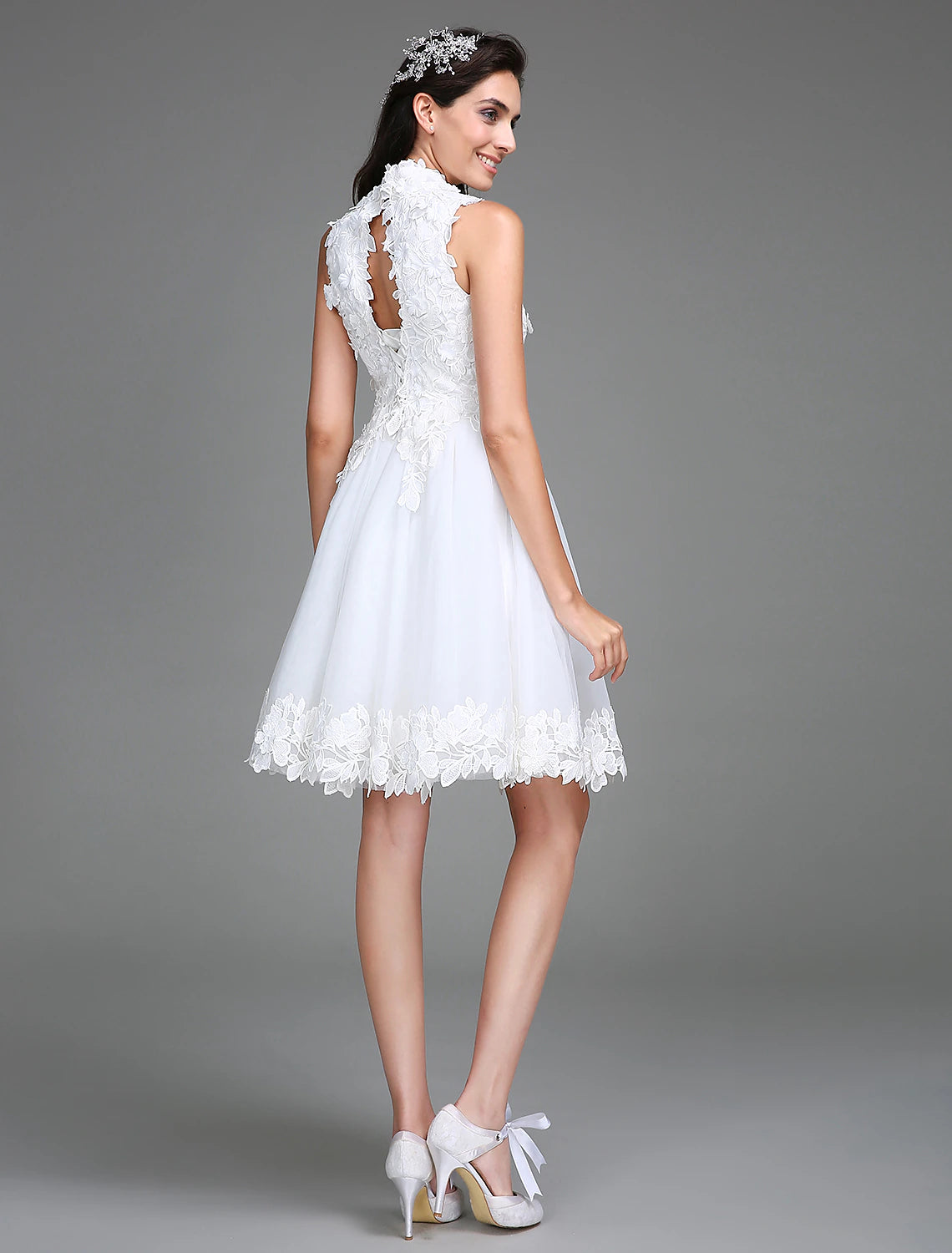 Petites robes blanches Robes de mariée Longueur genou Coupe trapèze Bretelles régulières Col haut Dentelle avec dentelle