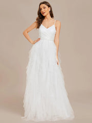 Robe de mariée scintillante en tulle à bretelles spaghetti et col en V - Blanc