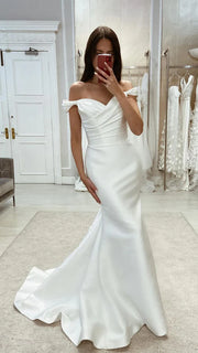 Robe de mariée de plage unique en satin évasé à épaules dénudées et traîne plissée