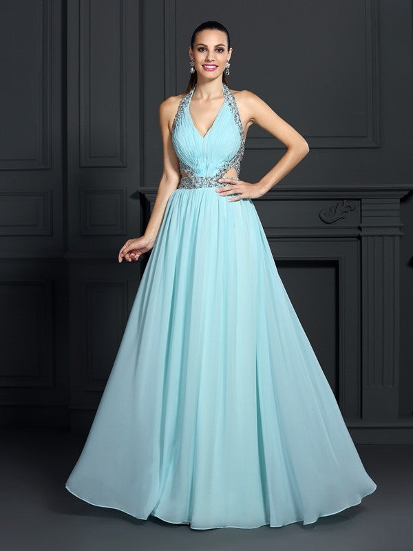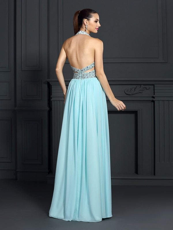 Robe longue en mousseline de soie, coupe trapèze/princesse, col licou, perles, sans manches