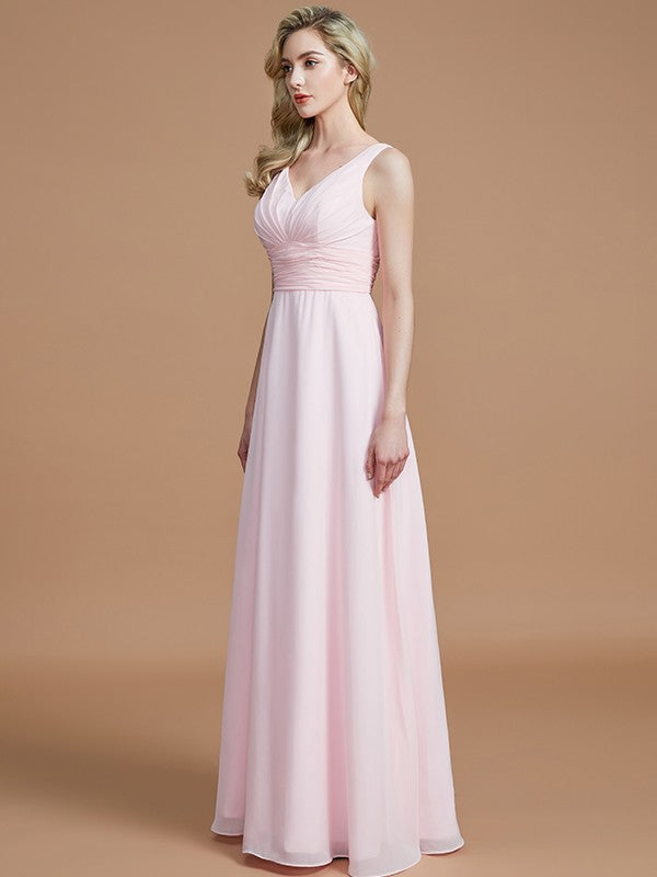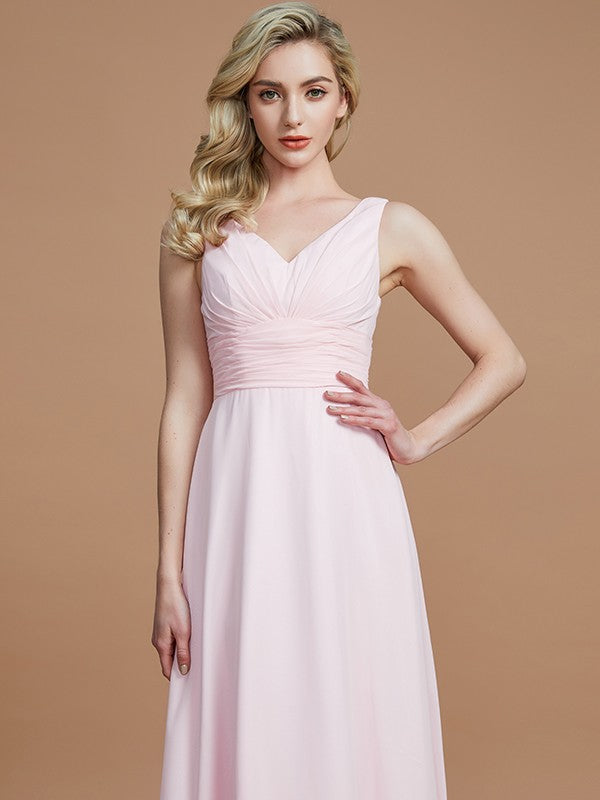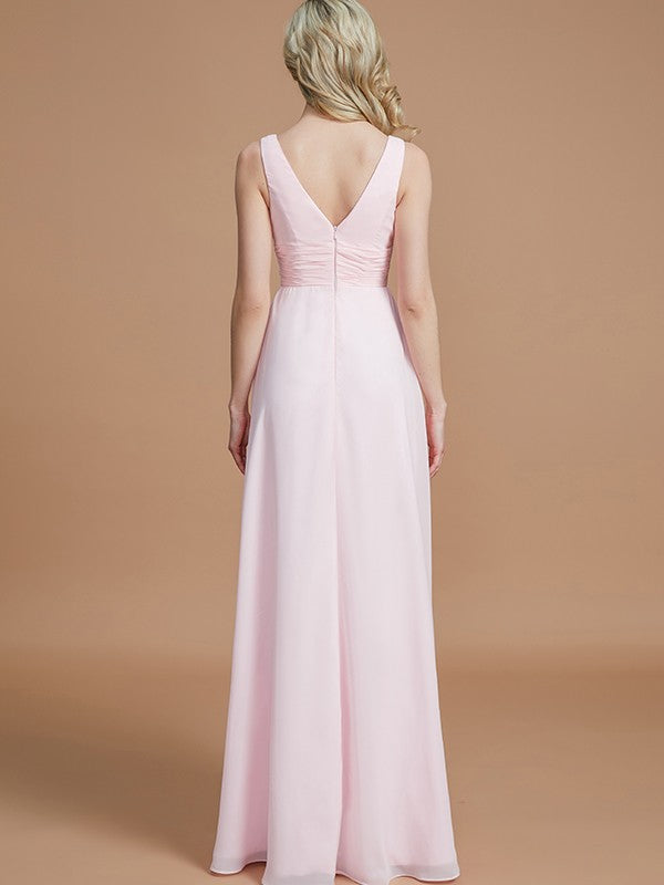 Robe de demoiselle d'honneur trapèze/princesse sans manches, longueur au sol, en mousseline, col en V