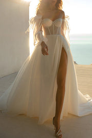 Robe de mariée fendue style campagnard à manches longues et décolleté en cœur - Blanc