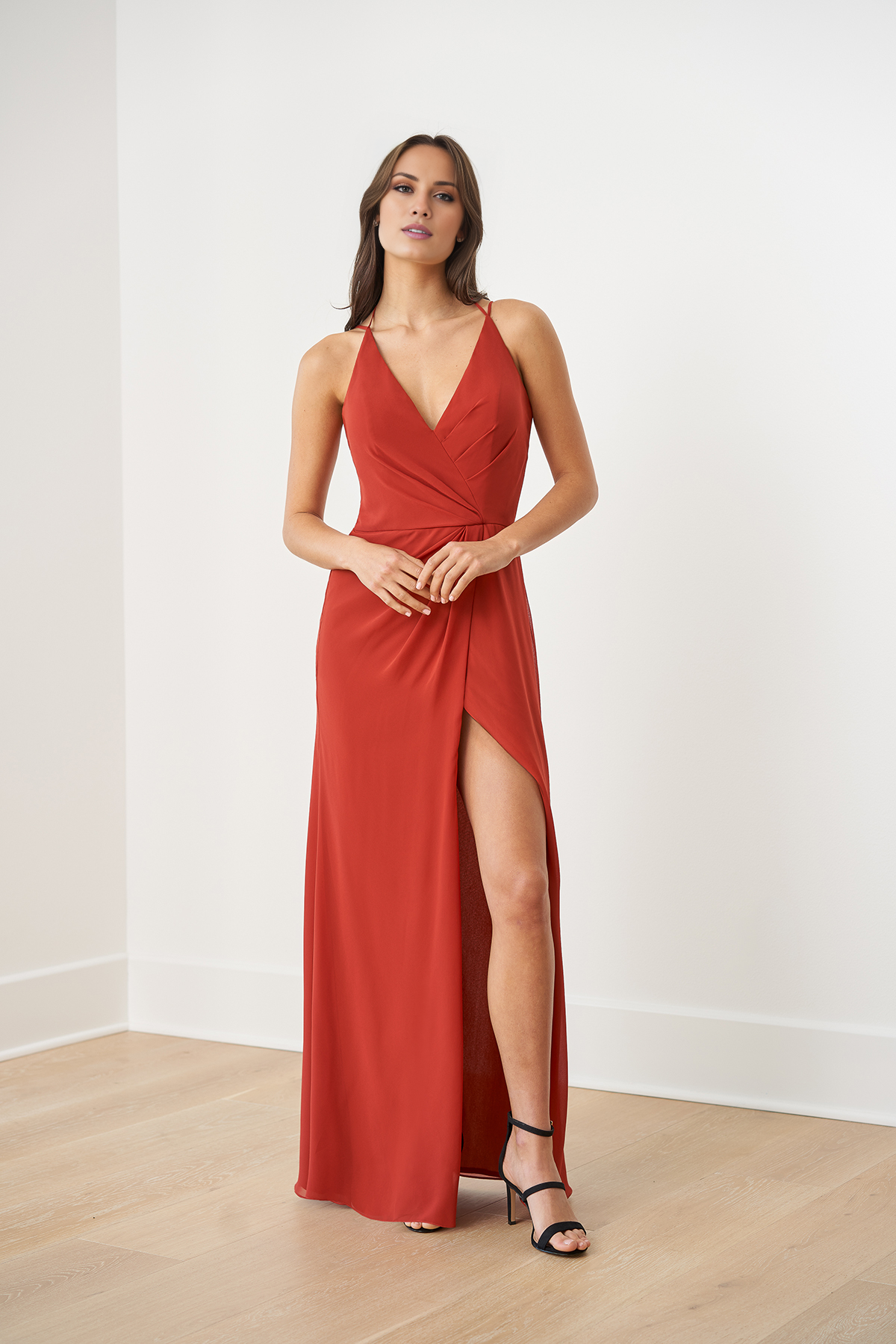 Robe de soirée longue à col en V et épaules dénudées, sans manches, fines bretelles, dos nu, fente latérale - US 2 / UK 6 / UE 32