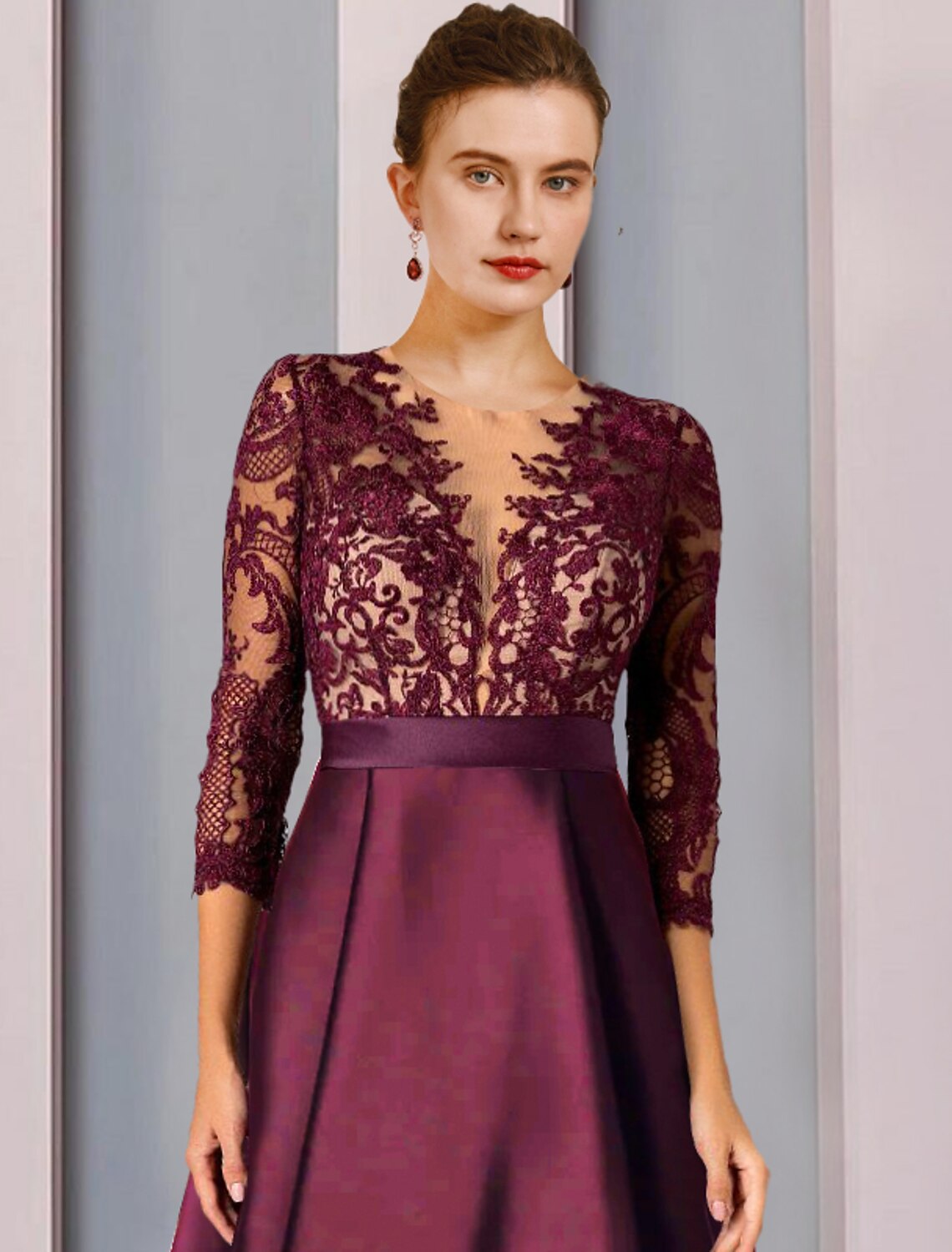 A-Line Mother of the Bride Dress Formal Church Elegant High Low Scoop Neck Asymmetrical Tea Length Satin Lace 3/4 Length Sleeve with Appliques