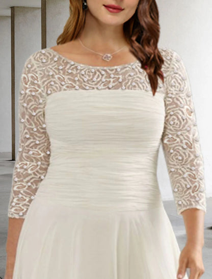 A-Line Mother of the Bride Dresses Plus Size Hide Belly Curve Elegant Dress Formal Tea Length 3/4 Length Sleeve Jewel Neck Chiffon with Ruched Beading Sequin Fall