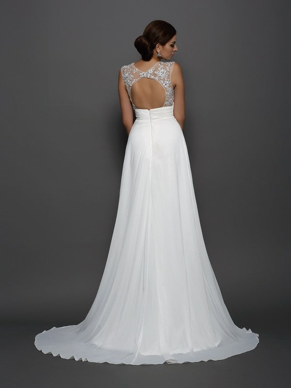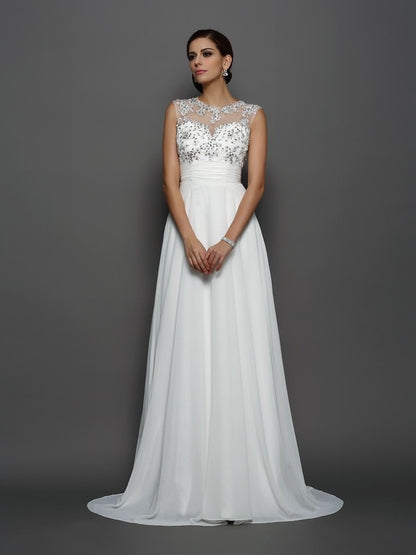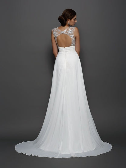 A-Line/Princess Bateau Applique Sleeveless Long Chiffon Dresses