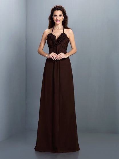 A-Line/Princess Halter Hand-Made Flower Sleeveless Long Chiffon Bridesmaid Dresses