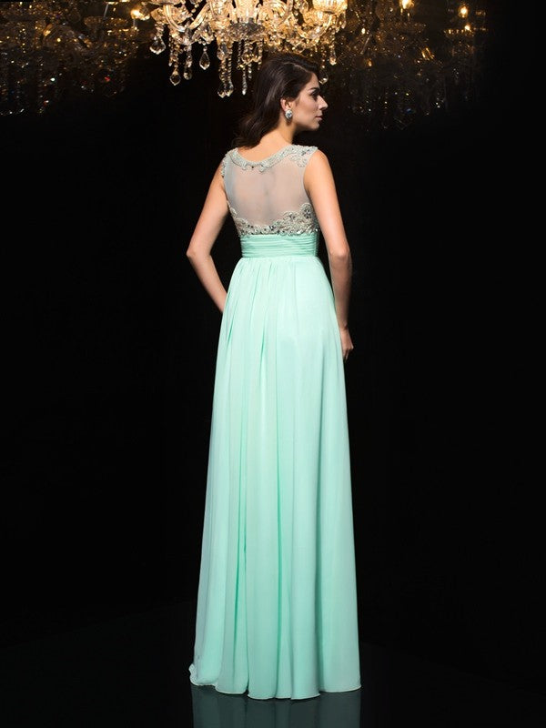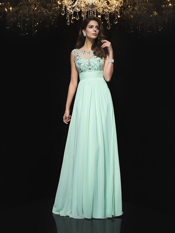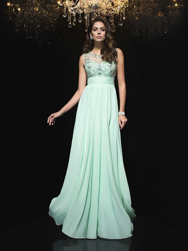 A-Line/Princess Sheer Neck Beading Sleeveless Long Chiffon Dresses