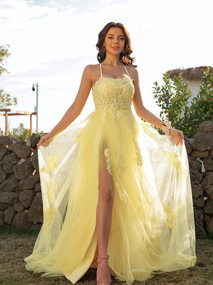 A-Line/Princess Tulle Applique Halter Sleeveless Sweep/Brush Train Dresses