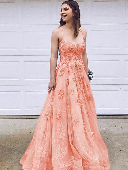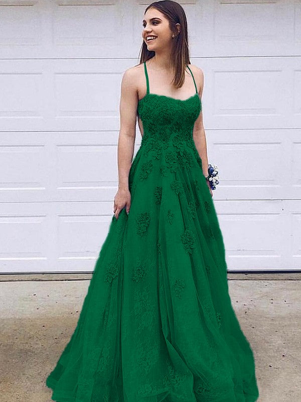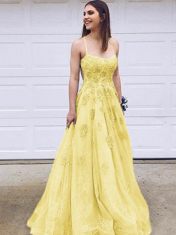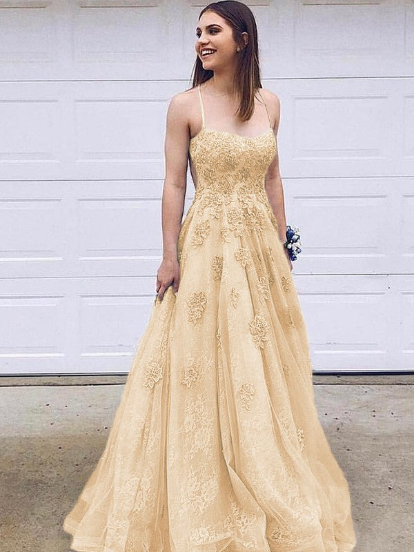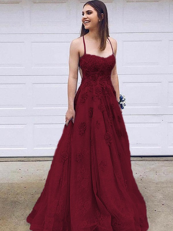 A-Line/Princess Tulle Applique Spaghetti Straps Sleeveless Sweep/Brush Train Dresses